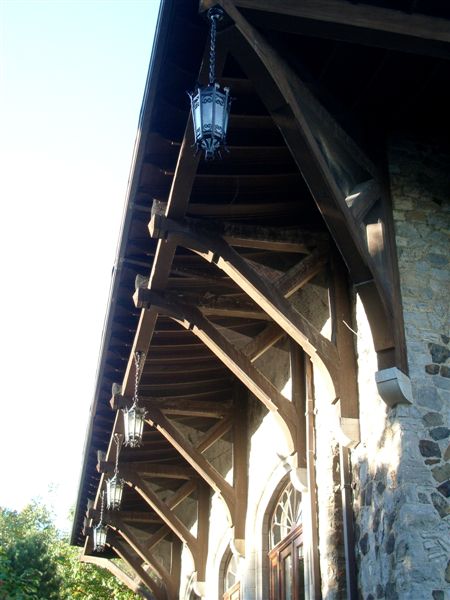 氣派小屋由灰白石牆、木頭屋簷與優雅吊燈構成,近看多了些浪漫