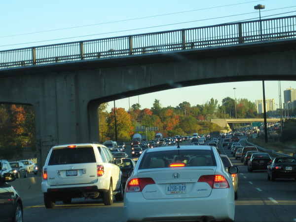 出發囉,見識到郊區人必須花上兩三小時通勤到多倫多市區的景況,瞧那長長車龍