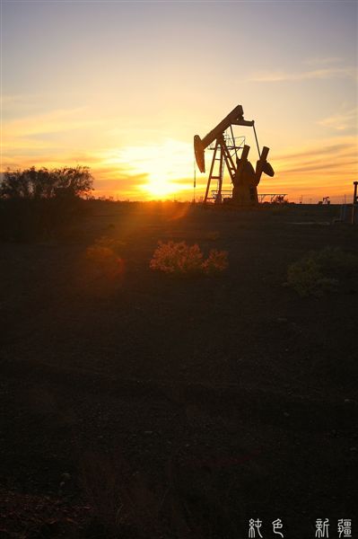 五彩城位於彩南油田中,一路上見多也不足為奇,未料白天呆呆的磕頭矬樣,襯著落日別有一番風情!