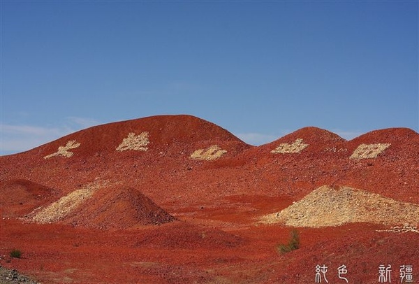 進入五彩城景區之前,途經火燒山油田的地標。火燒山和五彩城不同,連綿起伏的山丘不是五彩斑斕,而是一片赫紅,全是風蝕地貌構成。每逢黃昏,在朝陽或晚霞映照下,山體彷彿在熊熊燃燒,壯麗罕見。