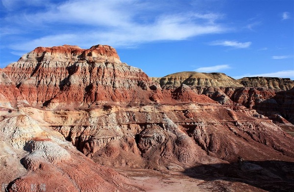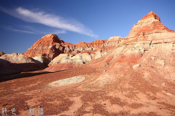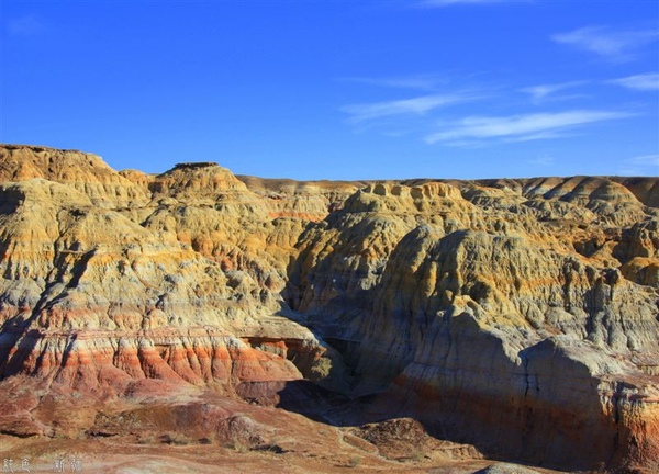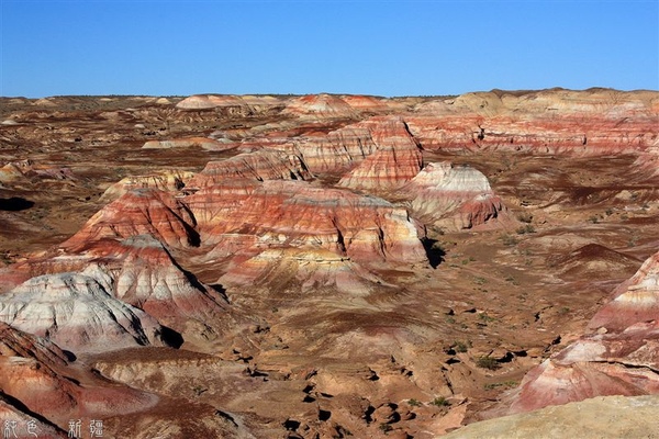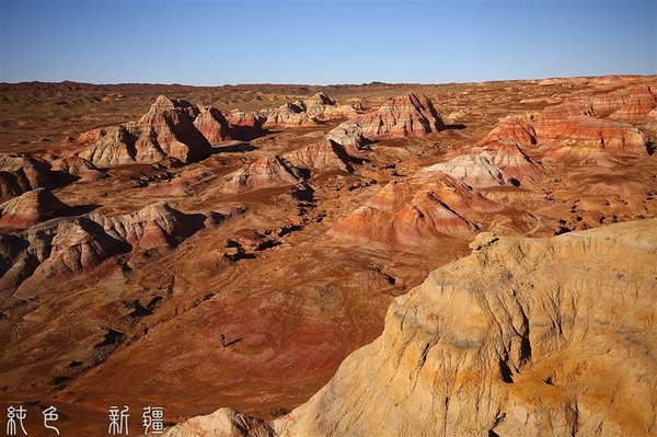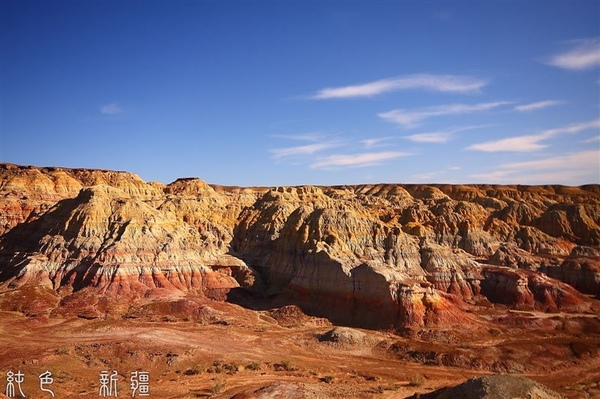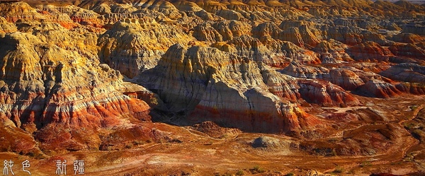 連綿的山丘,呈現赭紅為主夾雜著黃、白、黑、綠等多種色彩,再經風吹日曬雨剝,呈"雅丹地貌",遠望近觀,狀如城廓,五彩城由此得名。