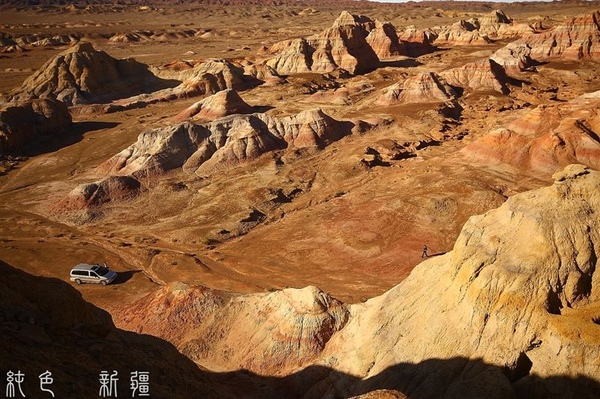 以往去五彩城可不是件易事,不但路途遙遠,而且根本無路可通,也難怪前人稱它為有去無回之地。拜開發大西北政策所賜,現今從烏魯木齊到彩南油田兩百多公里是路況良好的一級柏油路面,但從彩南油田到五彩城景區大概有40公里的河床砂石路面,路途依舊非常顛簸!