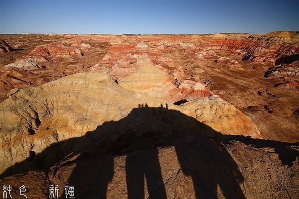 據說每當黃昏,整個五彩城被落日點燃,豔豔光彩為它加持,色彩一下子強烈起來,五彩城也變得絢麗多彩,被晚霞描繪的天空就像一個溫馨的彩罩,和五彩城融合在一起。為著這個人人讚嘆的黃昏絕景,大伙撐著晃著等著,偏偏"日頭赤炎炎",接近晚上九點,太陽依舊光亮炙熱可比午間一兩點!考慮到仍需經漫漫長路方抵下榻處,大家只好忍痛放棄等待。