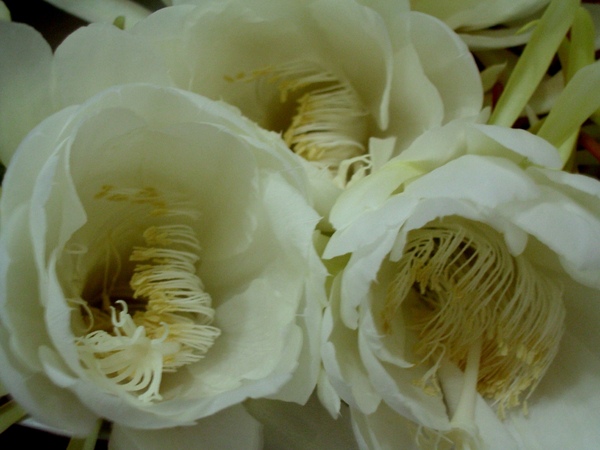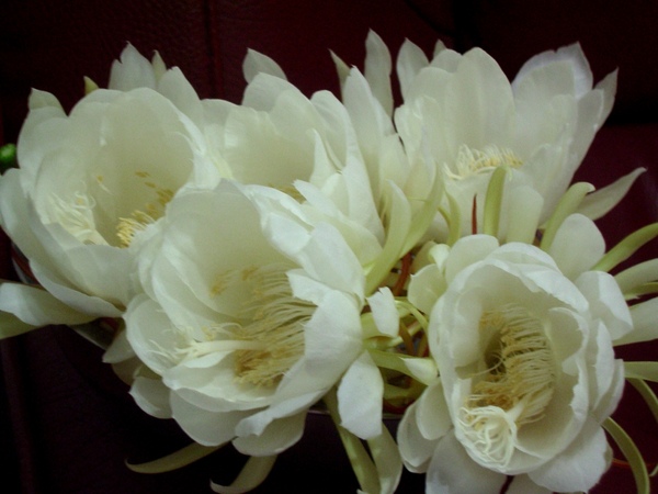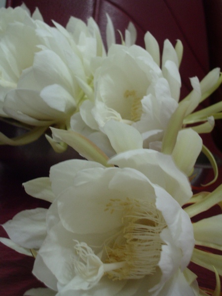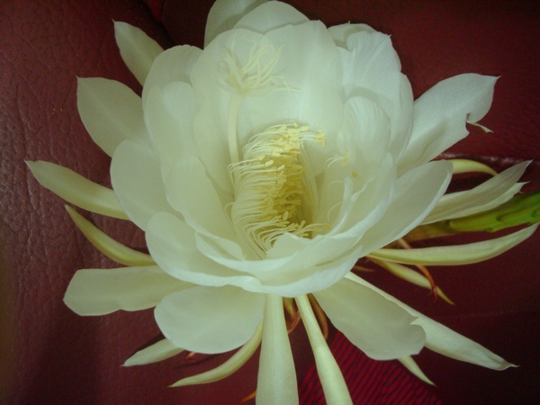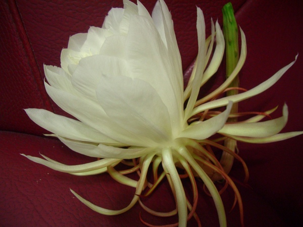 花大型,盛開時如碗口大,生於葉狀枝的邊緣,花重瓣、純白色,花瓣披針形,晚間開放,至次日早凋謝。