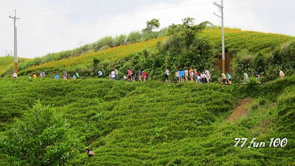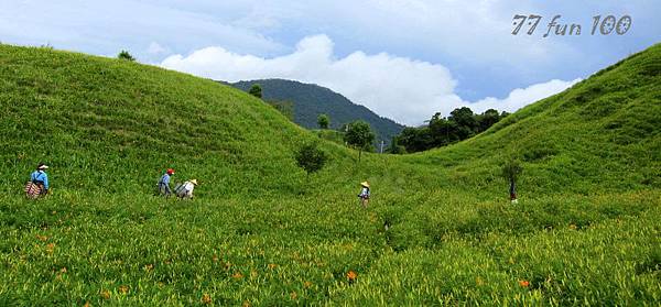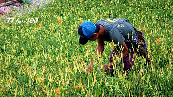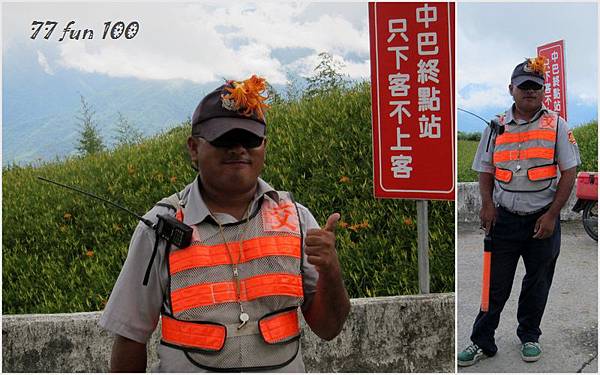 接近入口處,指揮交通的大哥,似乎怕黝黑膚色沒讓大家注意他,別上金針花的帽子讓人人都回頭看一眼。這一看不得了,他老兄竟然放車子上山! 把我們這些良民置於何處? 叫這些乖乖走路的人情何以堪呀?!